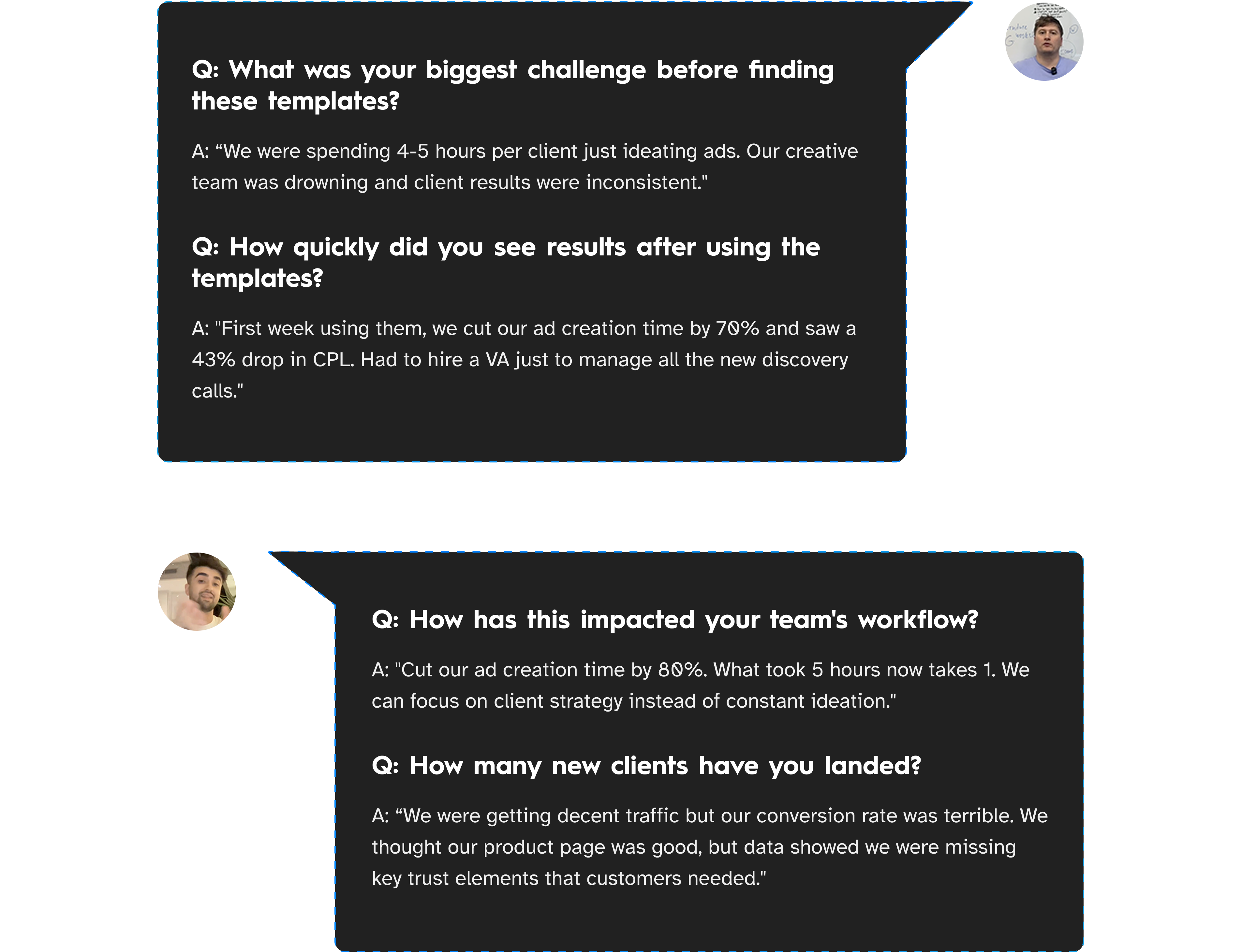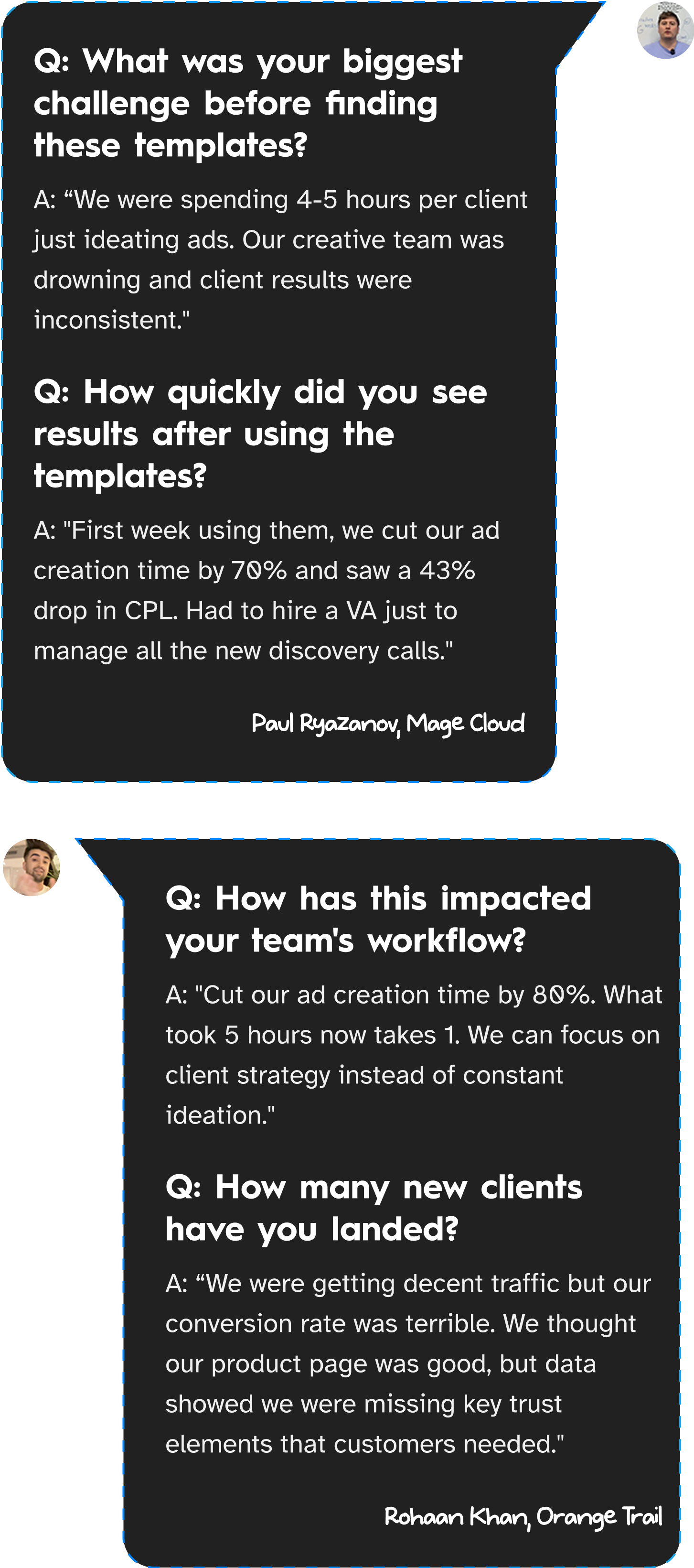 These aren't theoretical templates - they're the actual ads currently generating $500K/month for our agency (we’re literally running them as we speak). You're getting our real, proven ads with detailed breakdowns of why they work and how to adapt them for your agency.