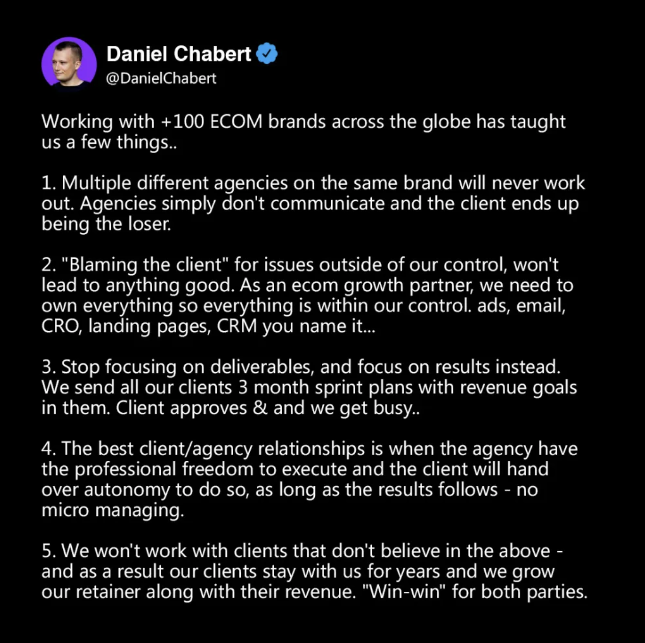 When you're closing $7K/month retainers, the math is simple: Even at a 25% close rate, spending $800 on 4 calls to land one $84K/year client is incredibly profitable. Plus, these leads are pre-qualified and pre-sold on your value. It’s how we were able to scale so it probably works.
